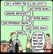 A cartoon has been circulating online for more than a decade, the kind of thing that lives on in Dad-joke Facebook feeds. In it, a grizzled Marine orders a black coffee at a modern café. The young barista, pierced, pencil-necked, aggressively polite, keeps offering flavored alternatives: soy latte, caramel macchiato, iced peppermint mocha. Each time the Marine repeats, “Just coffee. Black.” Finally, when the barista suggests a “Frappe,” the woman behind him snaps, “For cryin’ out loud, make up your mind and order!”