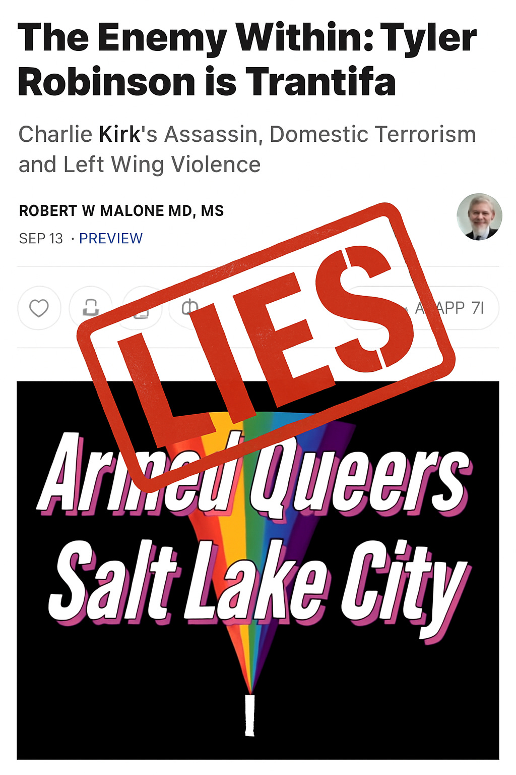 Now Malone has moved beyond medical nonsense to outright political extremism. He is rejecting the plain facts about the latest campus shooting. He posted this outrageous article the day AFTER the shooter was captured and long after absurd rumors pushed by reckless MAGA politicians