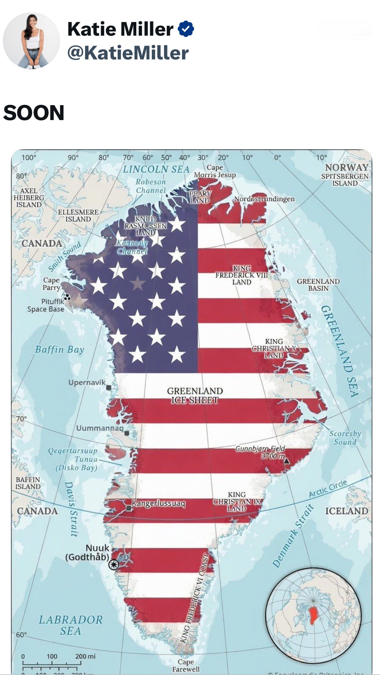 It shows Greenland covered by an American flag with one word: “SOON.”